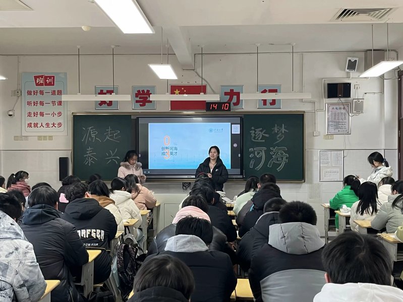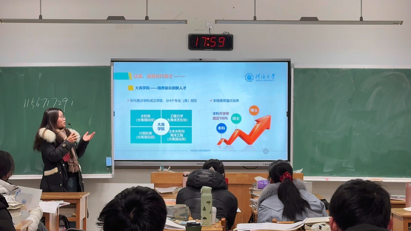 团队成员在正式宣讲前,提前与老师沟通好相关事宜,并循环播放河海大学招生宣传片《润泽》,让同学们初步认识了解河海大学。