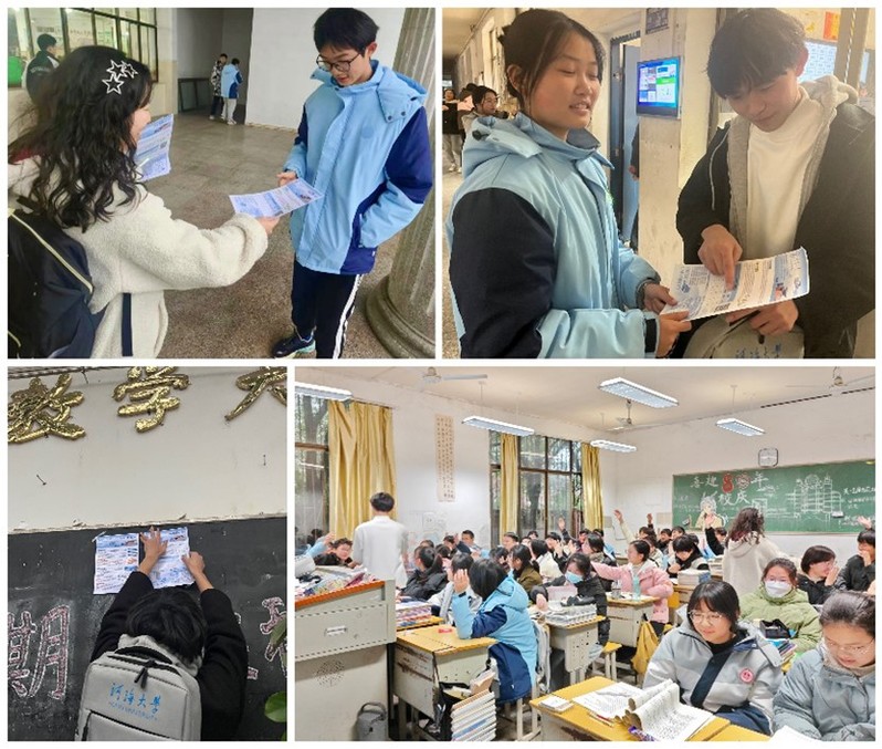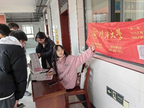 介绍结束后,团队组织了提问环节,同学们踊跃发言,现场气氛活跃。成员们耐心解答问题,并分享了自身在备战高考和心态调整方面的心得,鼓励高中生们脚踏实地、沉着应考。除此之外,团队还在人流量大的教学楼和食堂张贴海报及分发传单以扩大宣传范围,表达了对更多优秀学子考进河海大学的期盼。